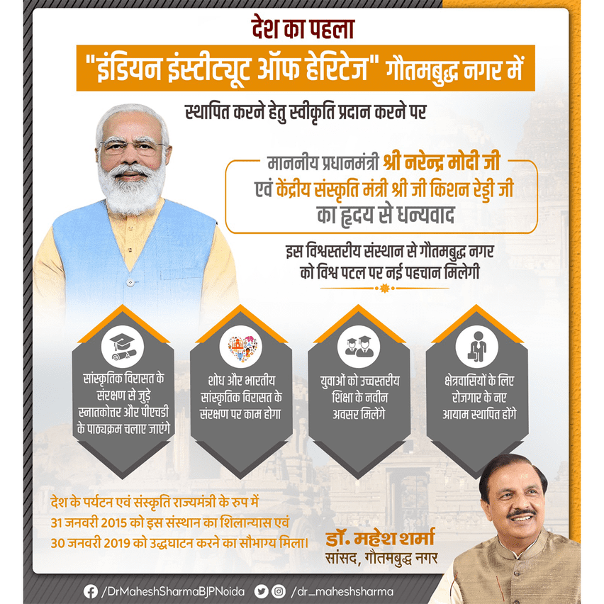 देश का पहला “इंडियन इंस्टीट्यूट ऑफ हेरिटेज” गौतमबुद्ध नगर में स्थापित करने हेतु स्वीकृति प्रदान करने पर माननीय प्रधानमंत्री श्री नरेन्द्र मोदी जी – एवं केंद्रीय संस्कृति मंत्री श्री जी किशन रेड्डी जी का हृदय से धन्यवाद इस विश्वस्तरीय संस्थान से गौतमबुद्ध नगर को विश्व पटल पर नई पहचान मिलेगी
