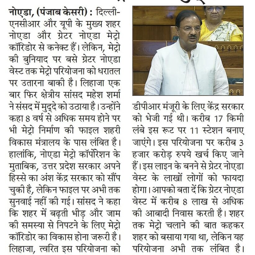 ग्रेटर नोएडा वेस्ट के विकास को नई रफ्तार देने के लिए संसद में मेट्रो विस्तार का अहम मुद्दा उठाया गया! 🚆