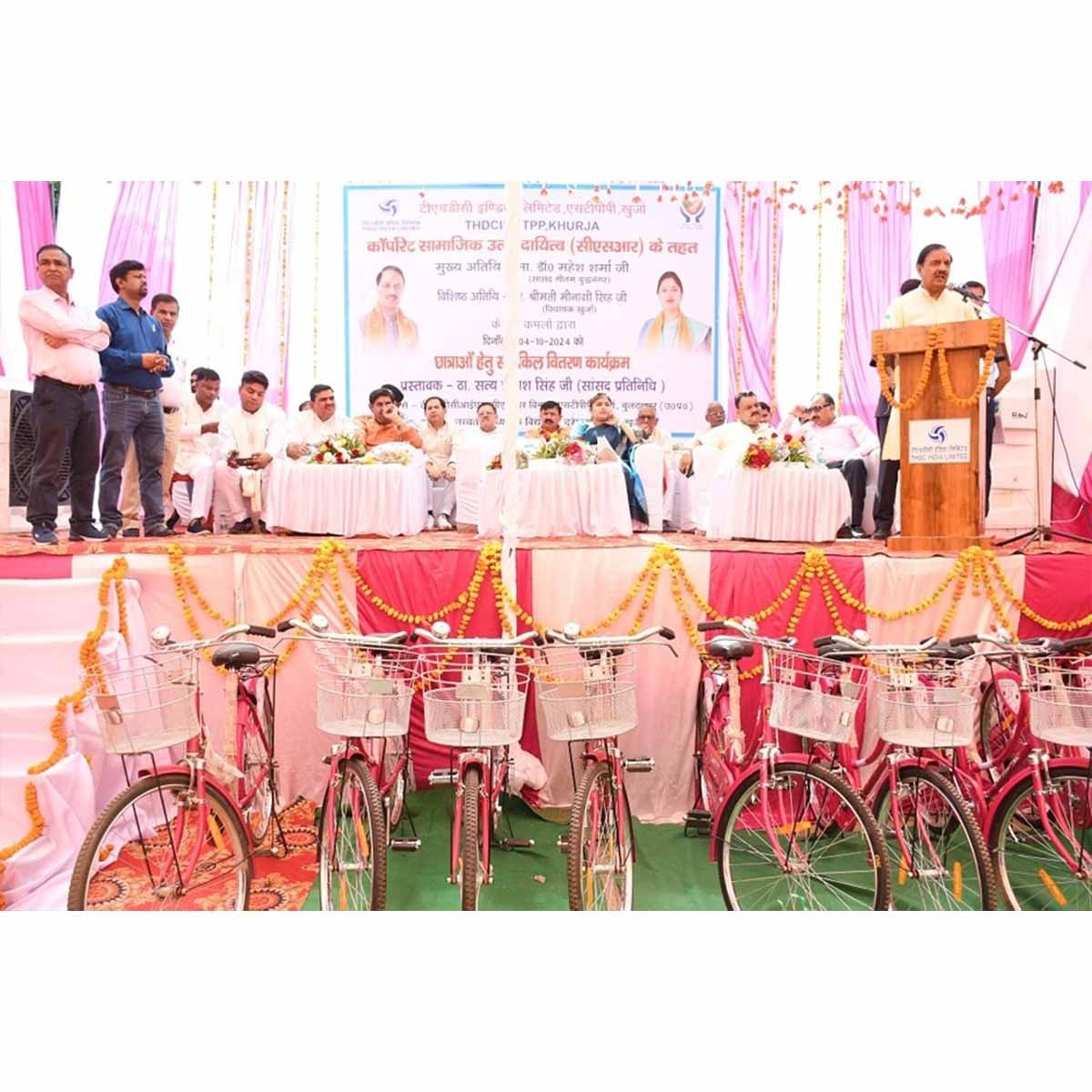 गौतमबुद्ध नगर के खुर्जा विधानसभा के ग्राम सभा दशहरा खरेली में, टीएचडीसी इंडिया लिमिटेड और एनटीपीसी खुर्जा के सीएसआर फंड के अंतर्गत एक महत्वपूर्ण कार्यक्रम आयोजित हुआ। इस कार्यक्रम में माननीय खुर्जा विधायक श्रीमती मीनाक्षी सिंह जी की उपस्थिति में छात्राओं को साइकिल वितरित की गईं। यह पहल शिक्षा के प्रति छात्राओं के उत्साह को प्रोत्साहित करने और उनकी पढ़ाई में सहूलियत प्रदान करने के उद्देश्य से की गई। इस अवसर पर डॉ. महेश शर्मा ने भी अपनी उपस्थिति दर्ज कराई और समाज की बेटियों के उज्जवल भविष्य के लिए शुभकामनाएं दीं।