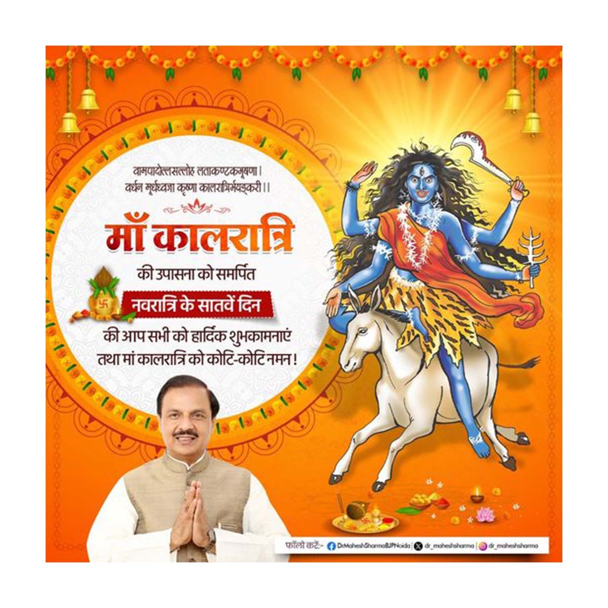 शक्ति की उपासना के पावन पर्व नवरात्रि के सातवें दिन परम कृपालु माँ कालरात्रि की उपासना की जाती है। माँ कालरात्रि से प्रार्थना करता हूं कि उनकी कृपा से आप सभी के जीवन में आ रही सभी बाधाओं का नाश हो और सुख, शांति, एवं सौभाग्य का संचार हो। माँ कालरात्रि का आशीर्वाद आप सभी को समृद्ध और सुरक्षित रखे। नवरात्रि के इस पावन अवसर पर माँ के दिव्य स्वरूप की आराधना से जीवन में नई ऊर्जा का संचार हो।