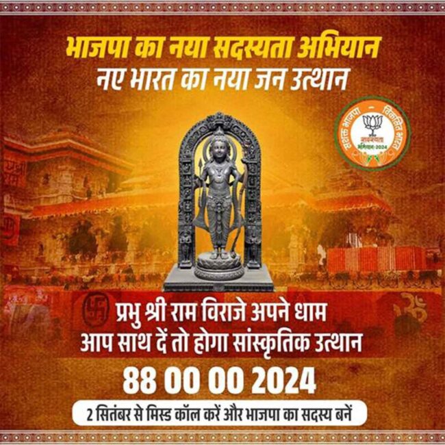 2 सितंबर से शुरू हो रहा भाजपा का नया सदस्यता अभियान। 88 00 00 2024 पर मिस्ड कॉल कर भाजपा का सदस्य बनें।