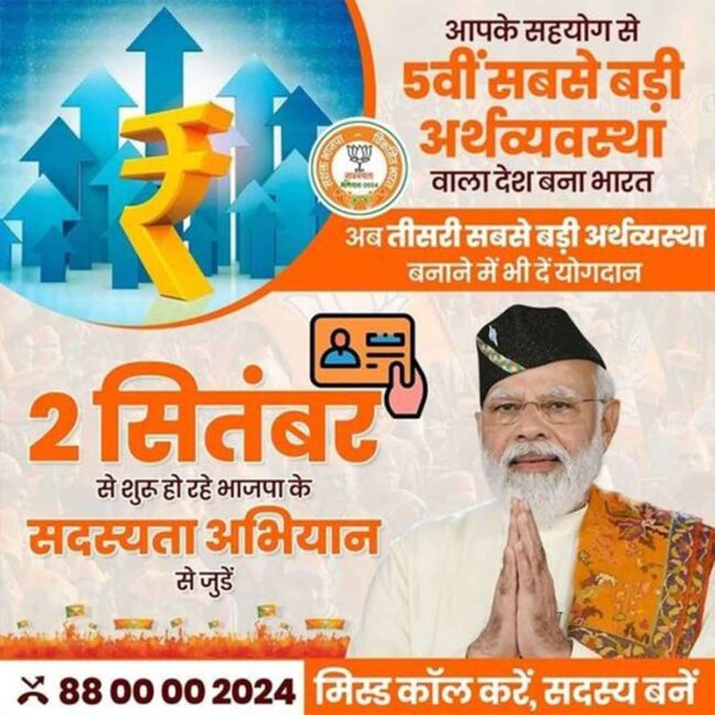 2 सितंबर से शुरू हो रहा भाजपा का नया सदस्यता अभियान। 88 00 00 2024 पर मिस्ड कॉल कर भाजपा का सदस्य बनें।