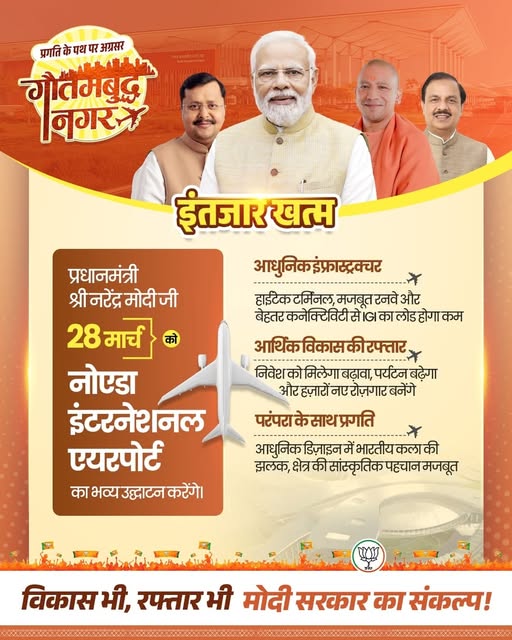 28 मार्च को माननीय प्रधानमंत्री श्री नरेंद्र मोदी जी द्वारा जेवर एयरपोर्ट के उद्घाटन के अवसर पर आयोजित ऐतिहासिक जनसभा में आप सभी सादर आमंत्रित हैं। यह कार्यक्रम क्षेत्र के विकास, प्रगति और नए अवसरों की दिशा में एक महत्वपूर्ण पड़ाव है। इस गौरवपूर्ण क्षण के साक्षी बनने के लिए आप सभी से आग्रह है…
