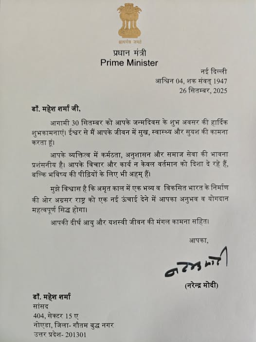 अपने जन्मदिवस पर आदरणीय प्रधानमंत्री श्री नरेंद्र मोदी जी द्वारा भेजे गए शुभकामना संदेश को पाकर हृदय से अभिभूत हूँ। प्रधानमंत्री जी का यह स्नेहिल संदेश न केवल मेरे लिए प्रेरणादायी है, बल्कि मुझे समाज एवं राष्ट्रहित में और अधिक समर्पण भाव से कार्य करने की शक्ति प्रदान करता है।