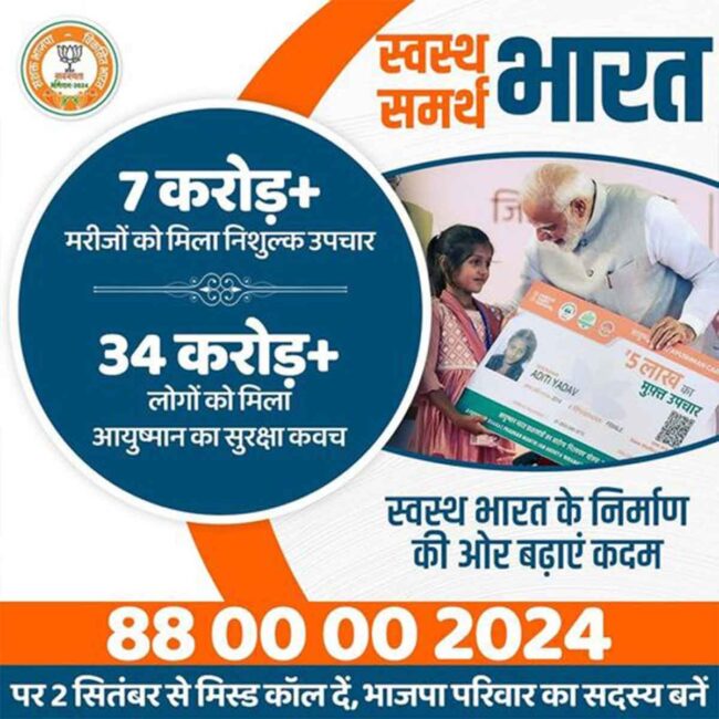 2 सितंबर से शुरू हो रहे भाजपा के नए सदस्यता अभियान से जुड़ें और 88 00 00 2024 पर मिस्ड कॉल कर भाजपा परिवार का सदस्य बनें।